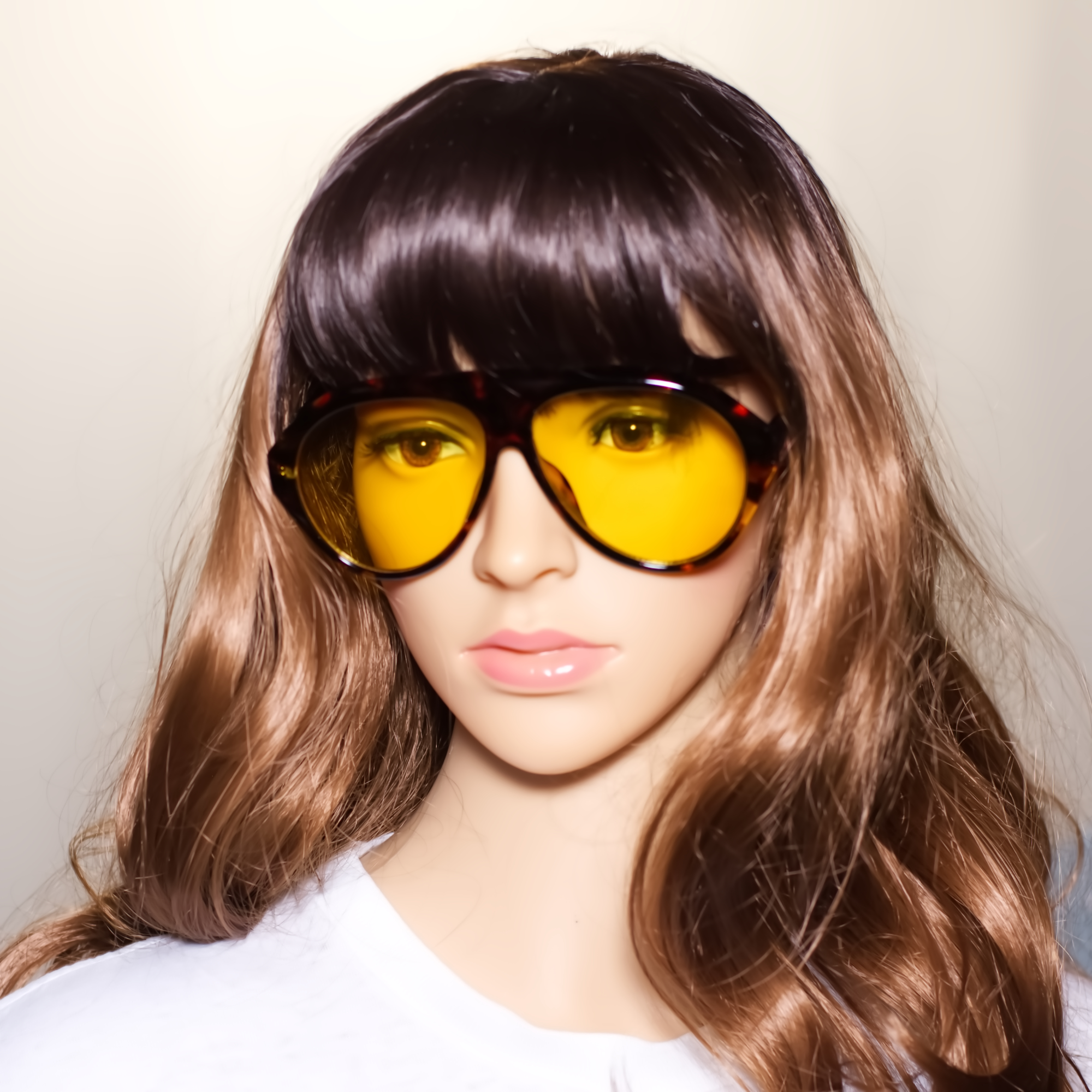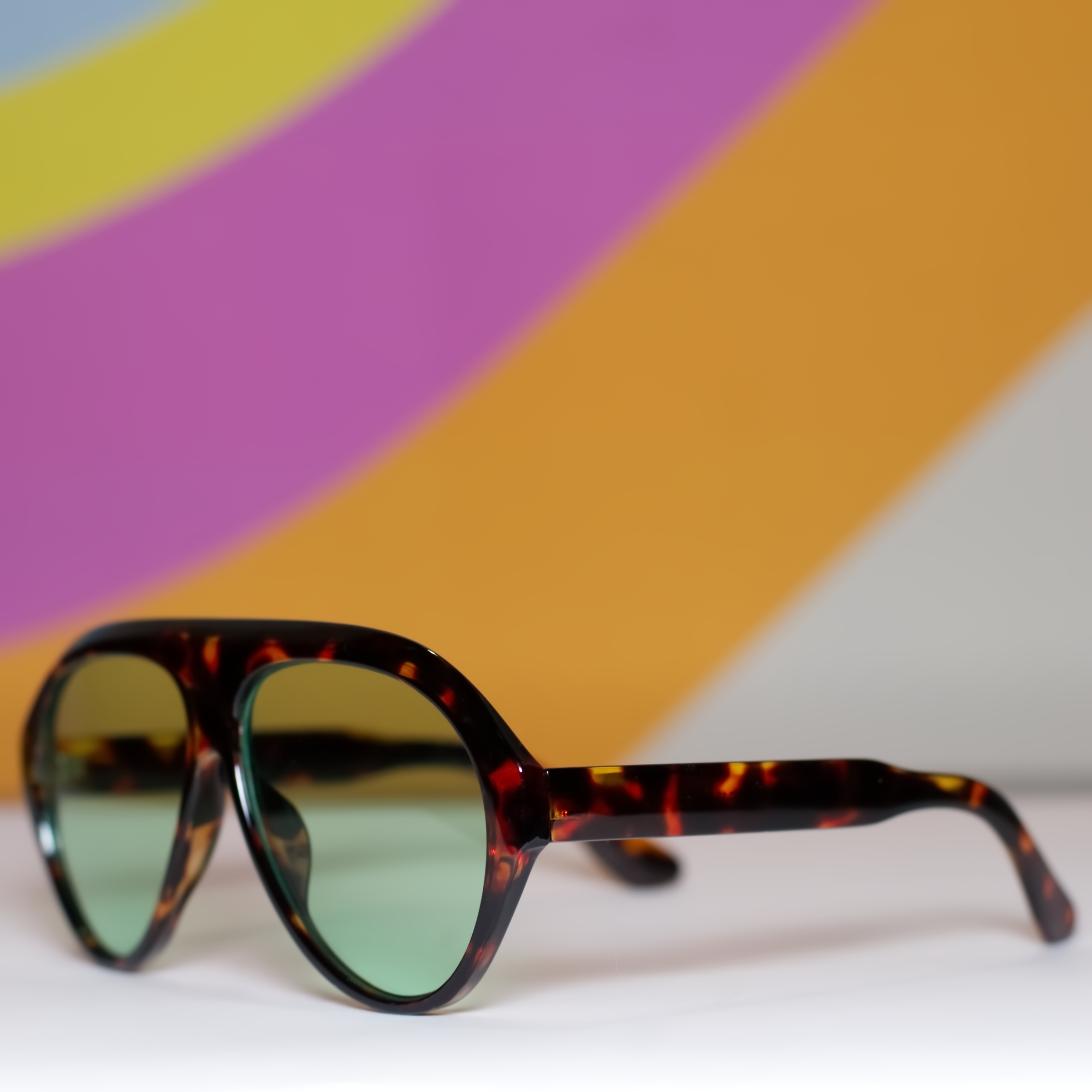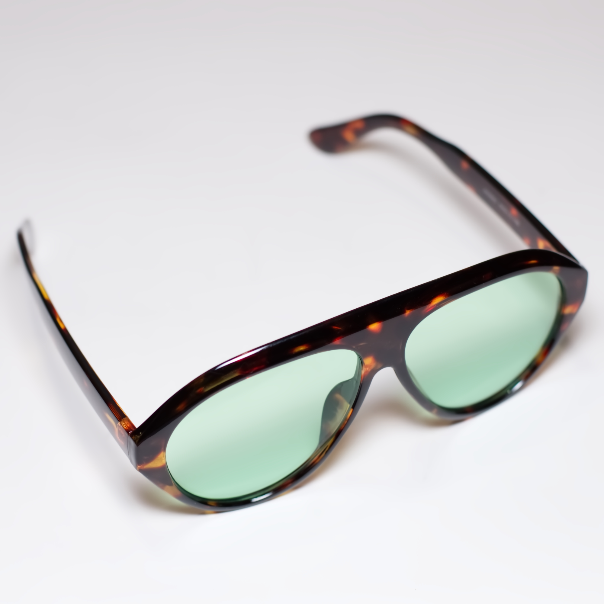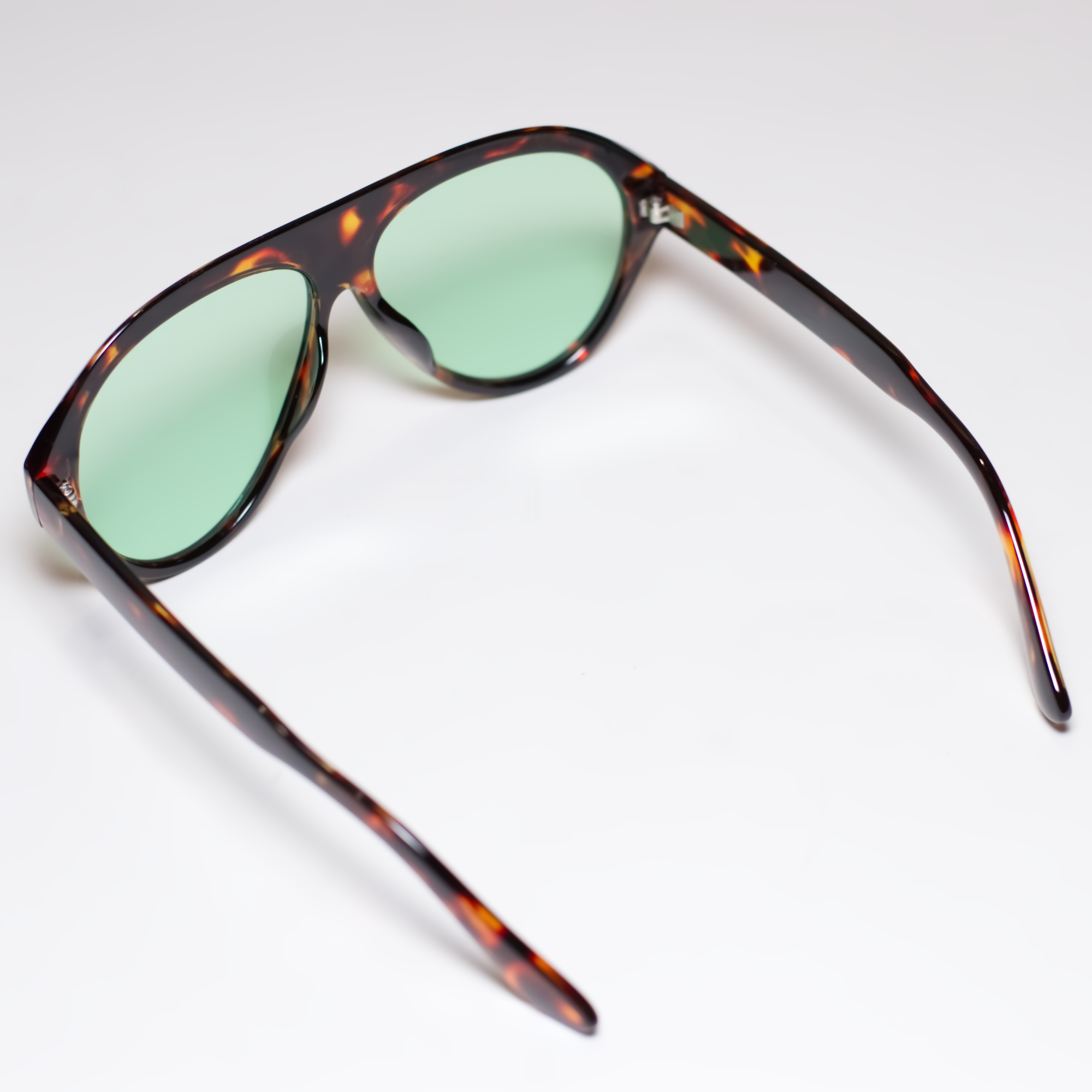 Awesome 80s inspired aviator sunglasses that are a bit oversized. A brown tortoise frame with your choice of either green or yellow light tint lenses.