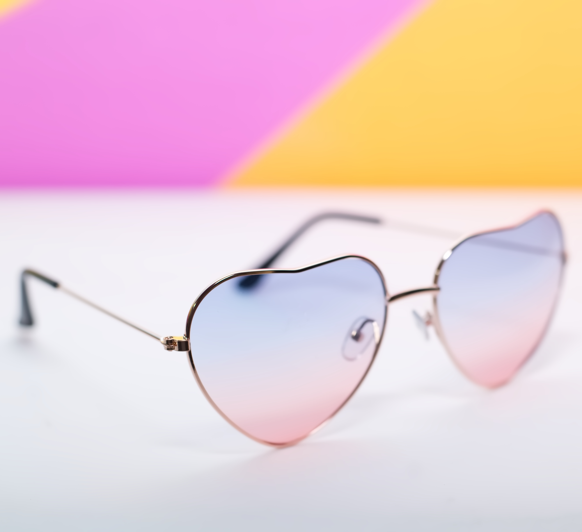SUPER CUTE heart sunglasses with a gold toned wire metal frame and glue to pink fade lenses.