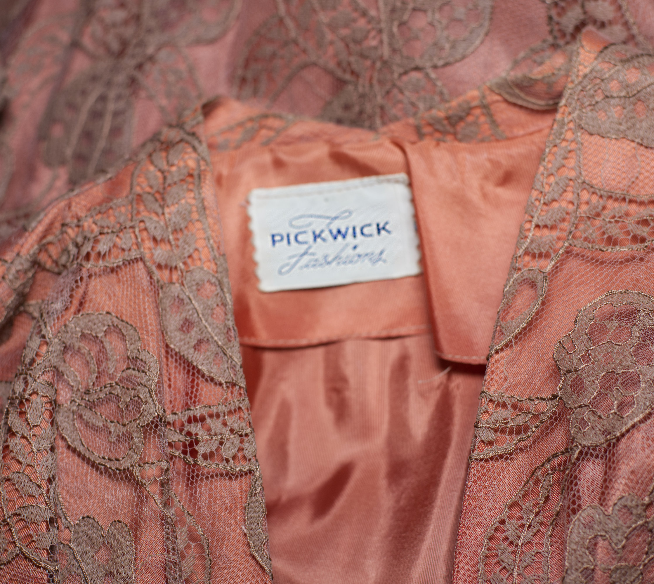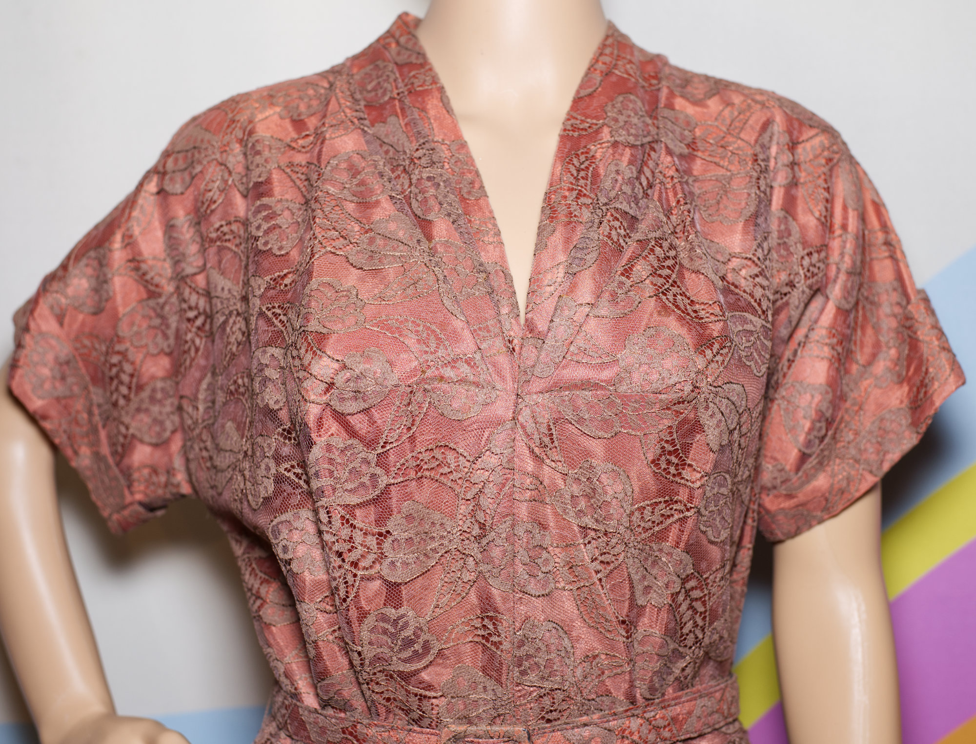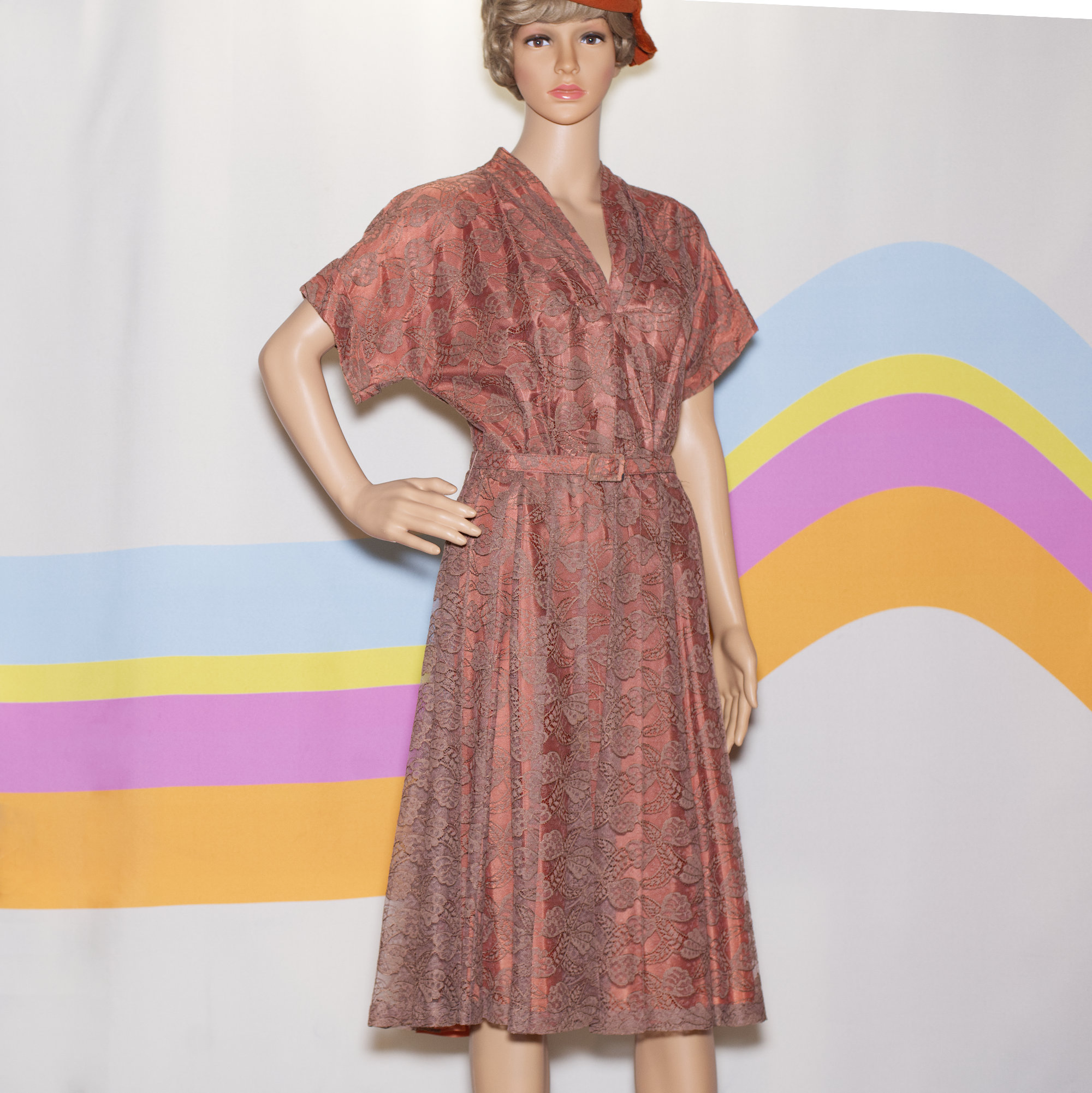 BEAUTIFUL late 40s/early 50s dress. This special dress has an under fabric that is a salmon orange, with a top lace that is a taupe brown. What make this dress a RARE find is that it is a “regular” size…so many of the dresses from this era were made for toothpick-sized women.