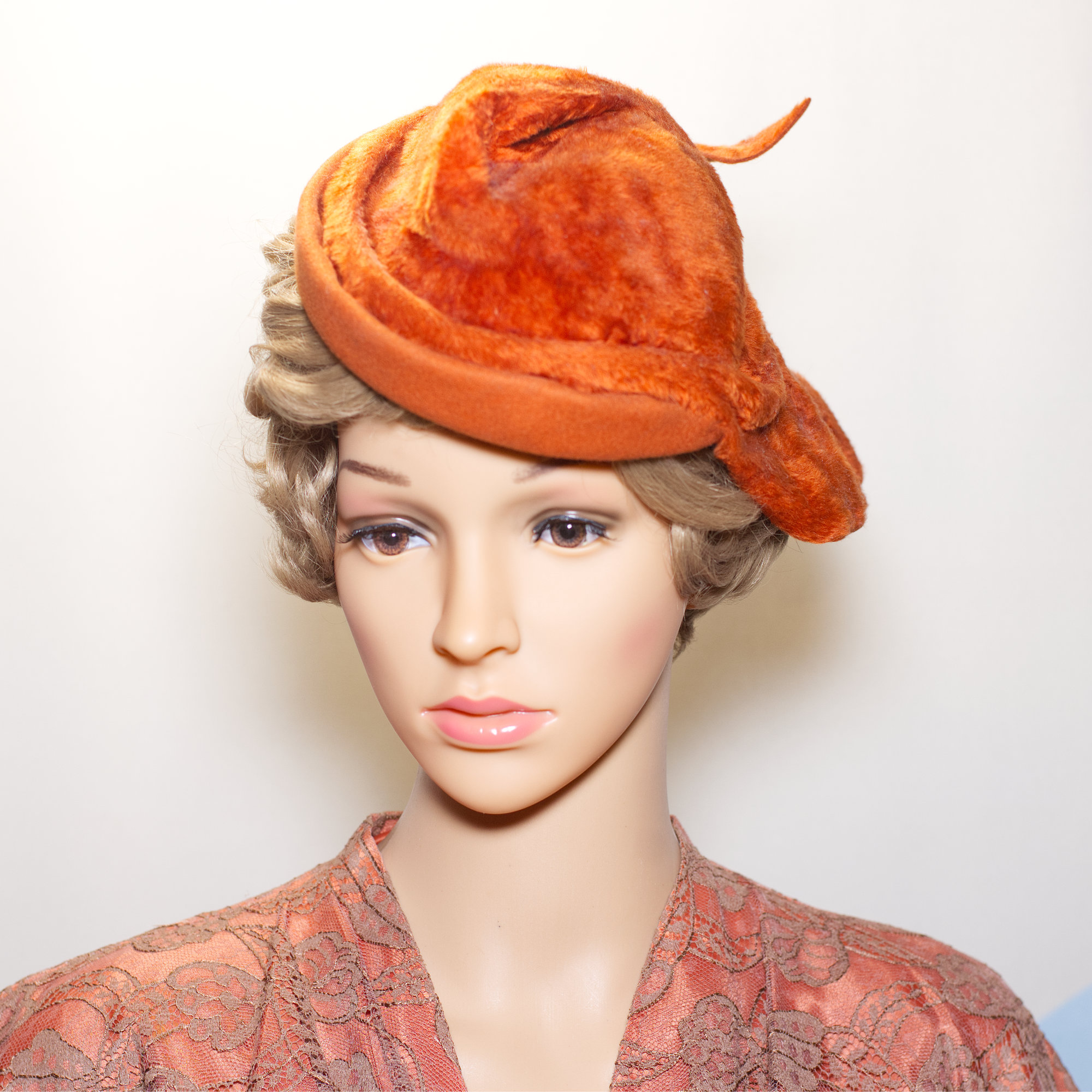 Unique 50s orange fuzzy wool felt asymmetric hat.