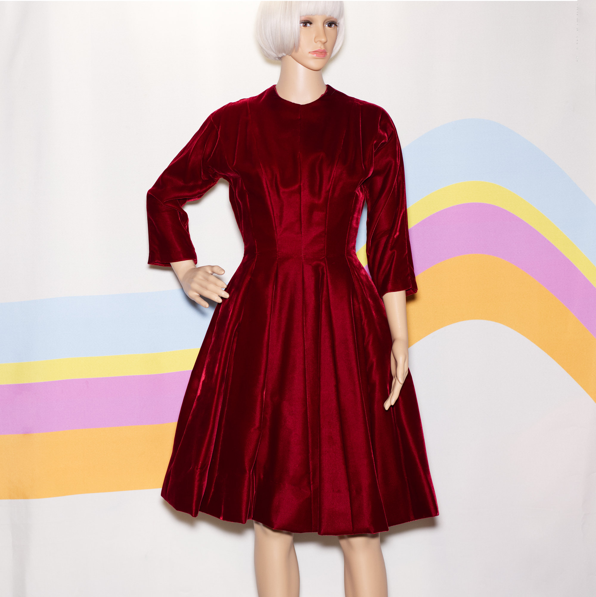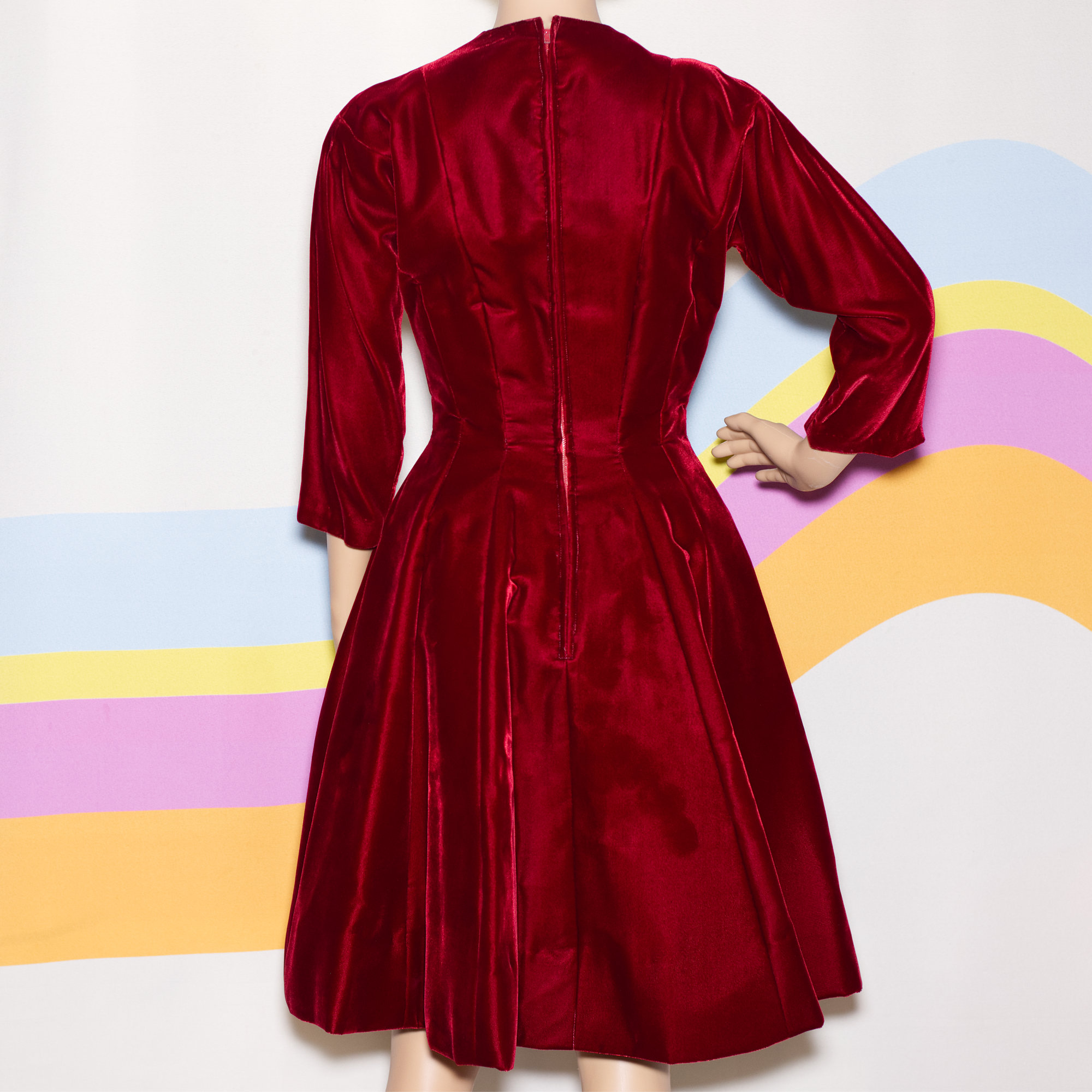 Stunning 50s red velvet dress. This is the perfect winter cocktail or party dress. The skirt is slightly structured to hold its shape.