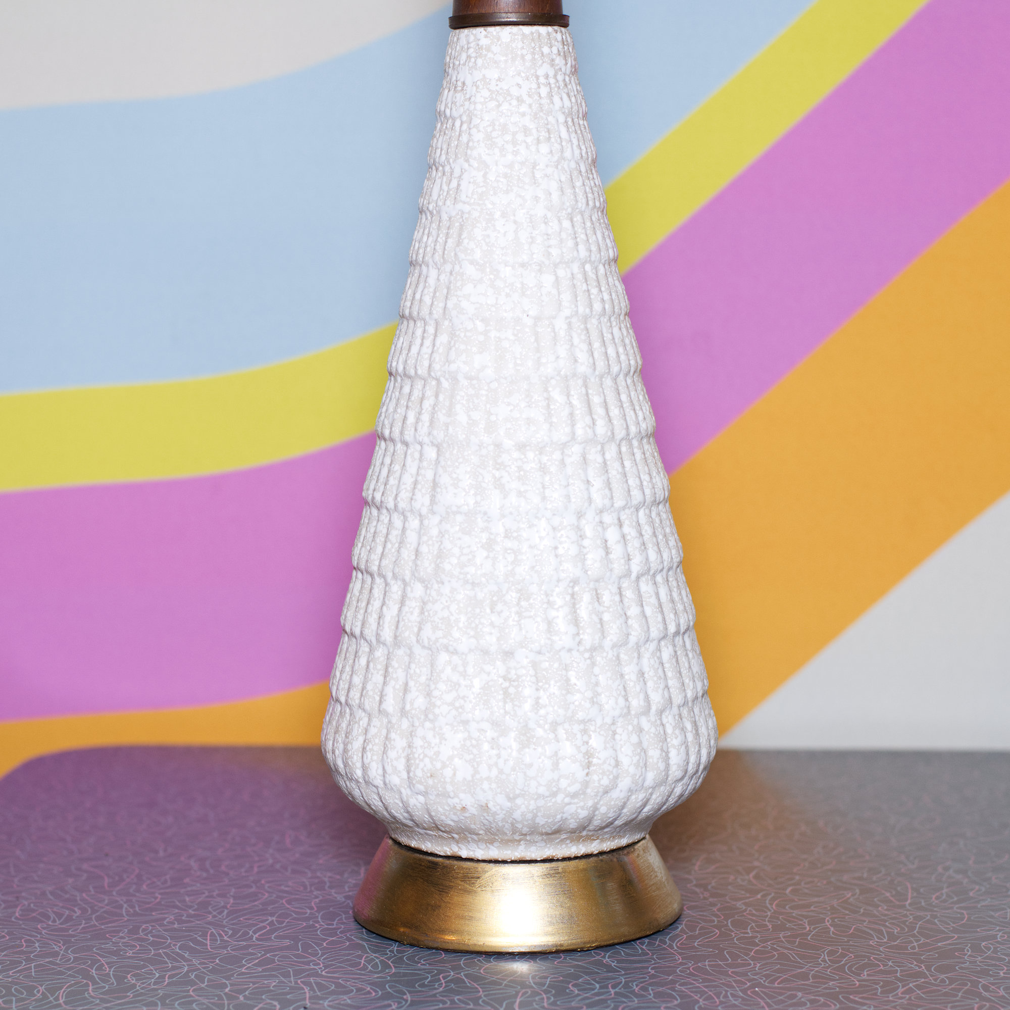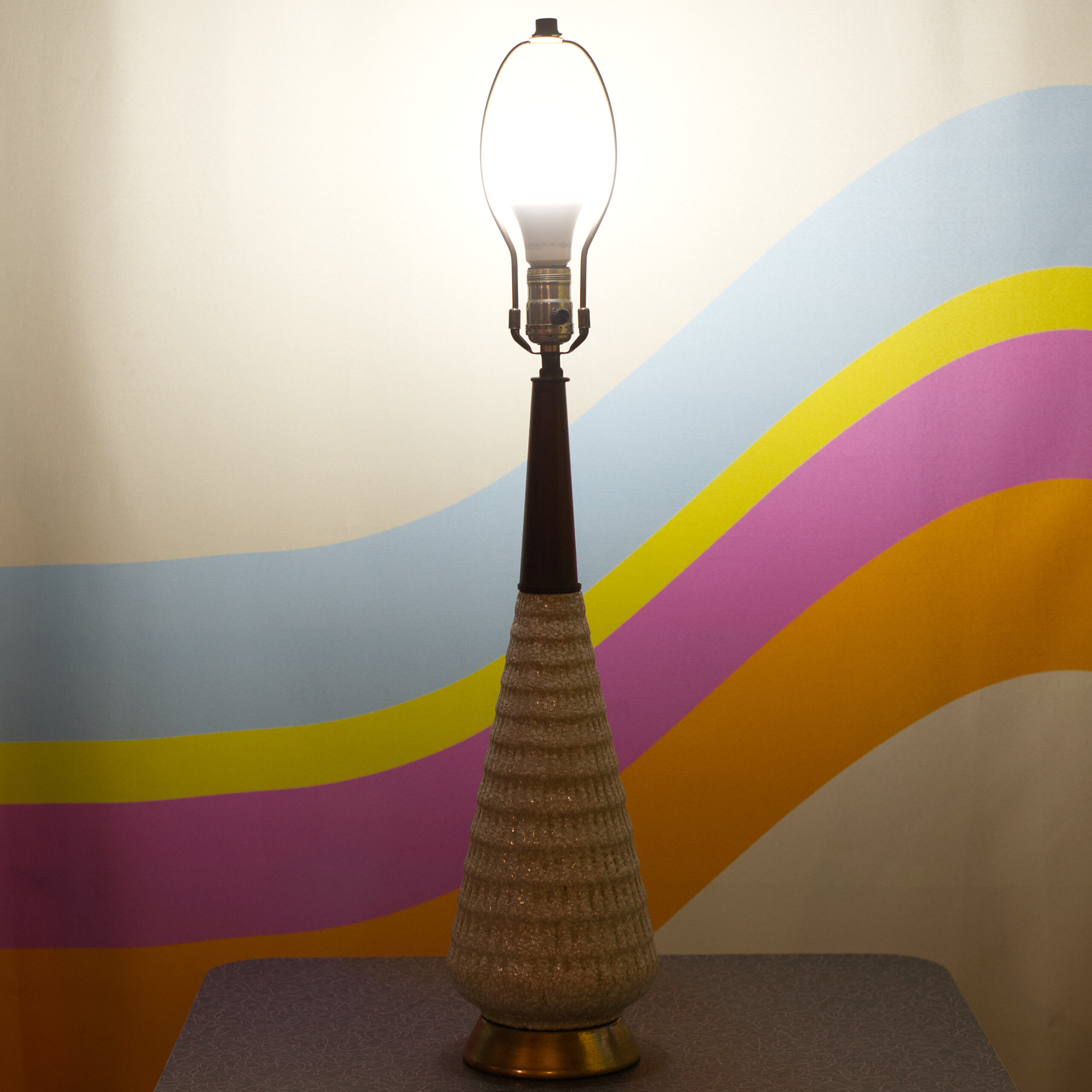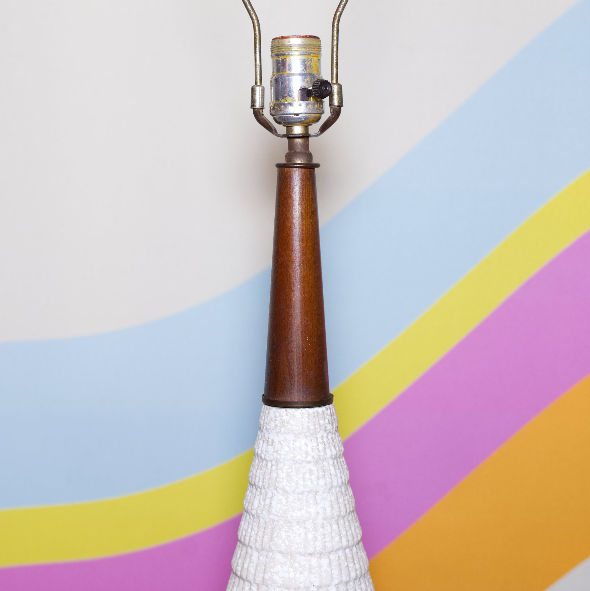Awesome 60s textured cream ceramic lamp with a teak wood neck accent.