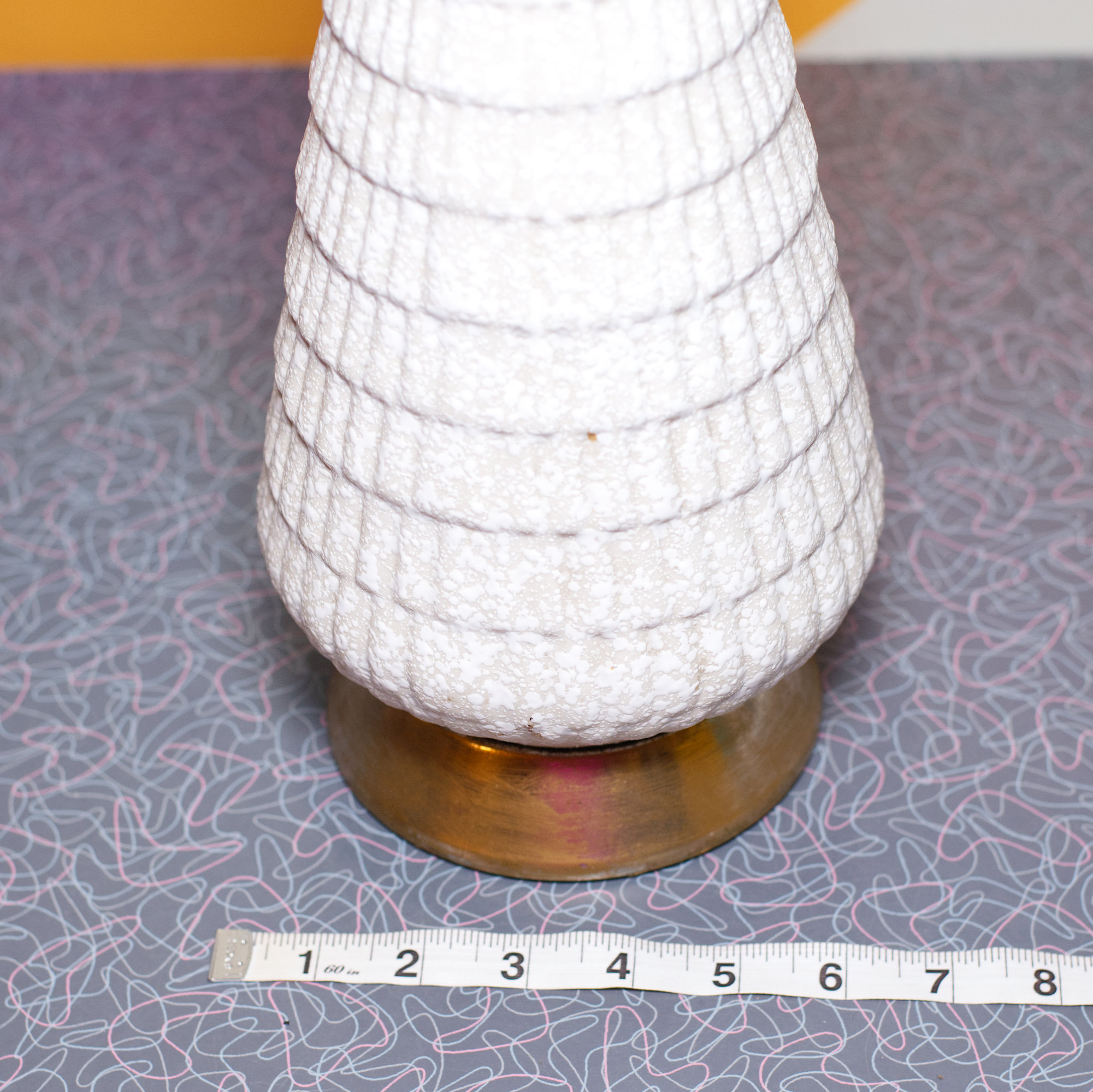 In good vintage condition, with the wear you would expect on a lamp this age (light blemishes). The lamp works with the original wiring. I personally would feel comfortable using the current unpolarized wiring, but it is always recommended to have it rewired to polarized wiring.