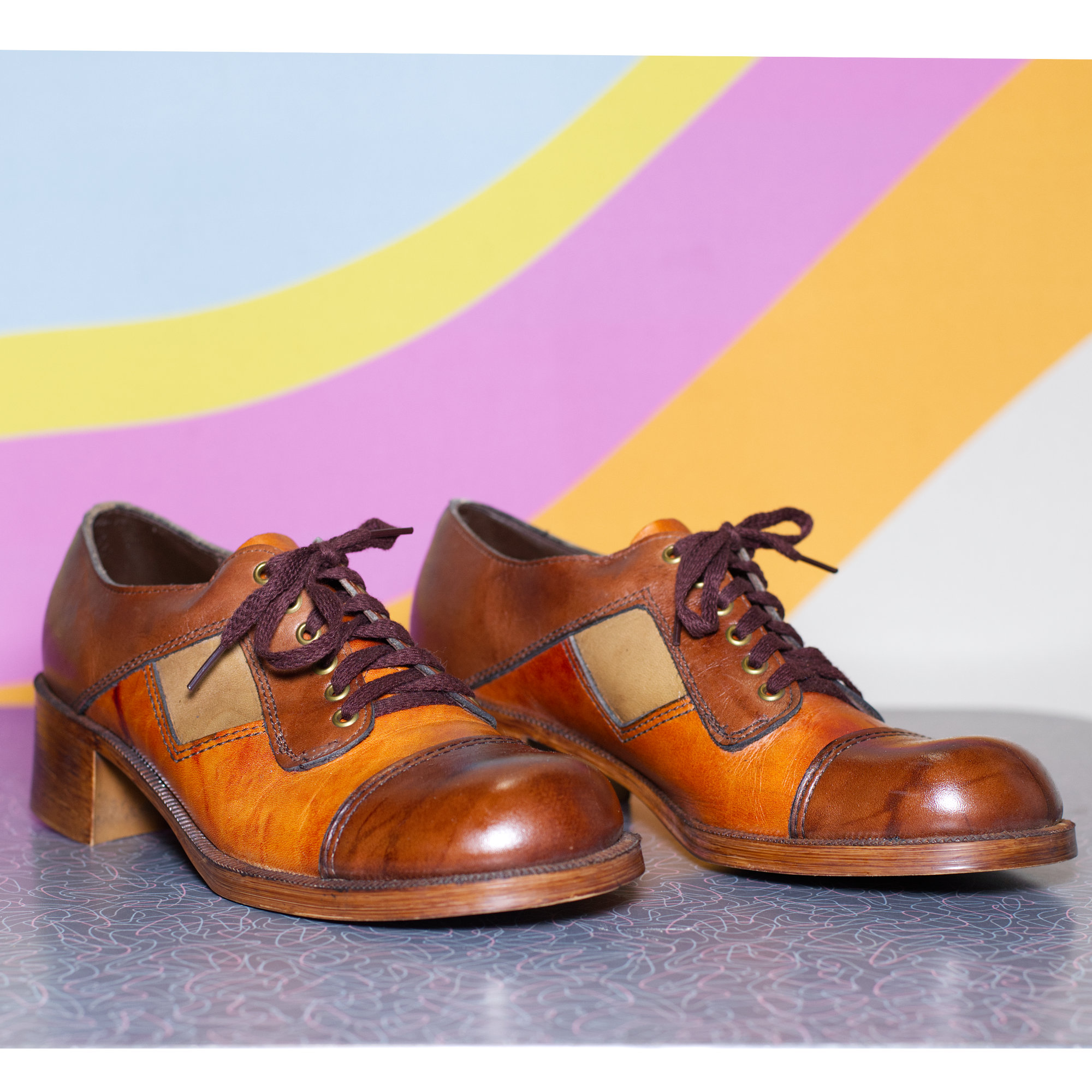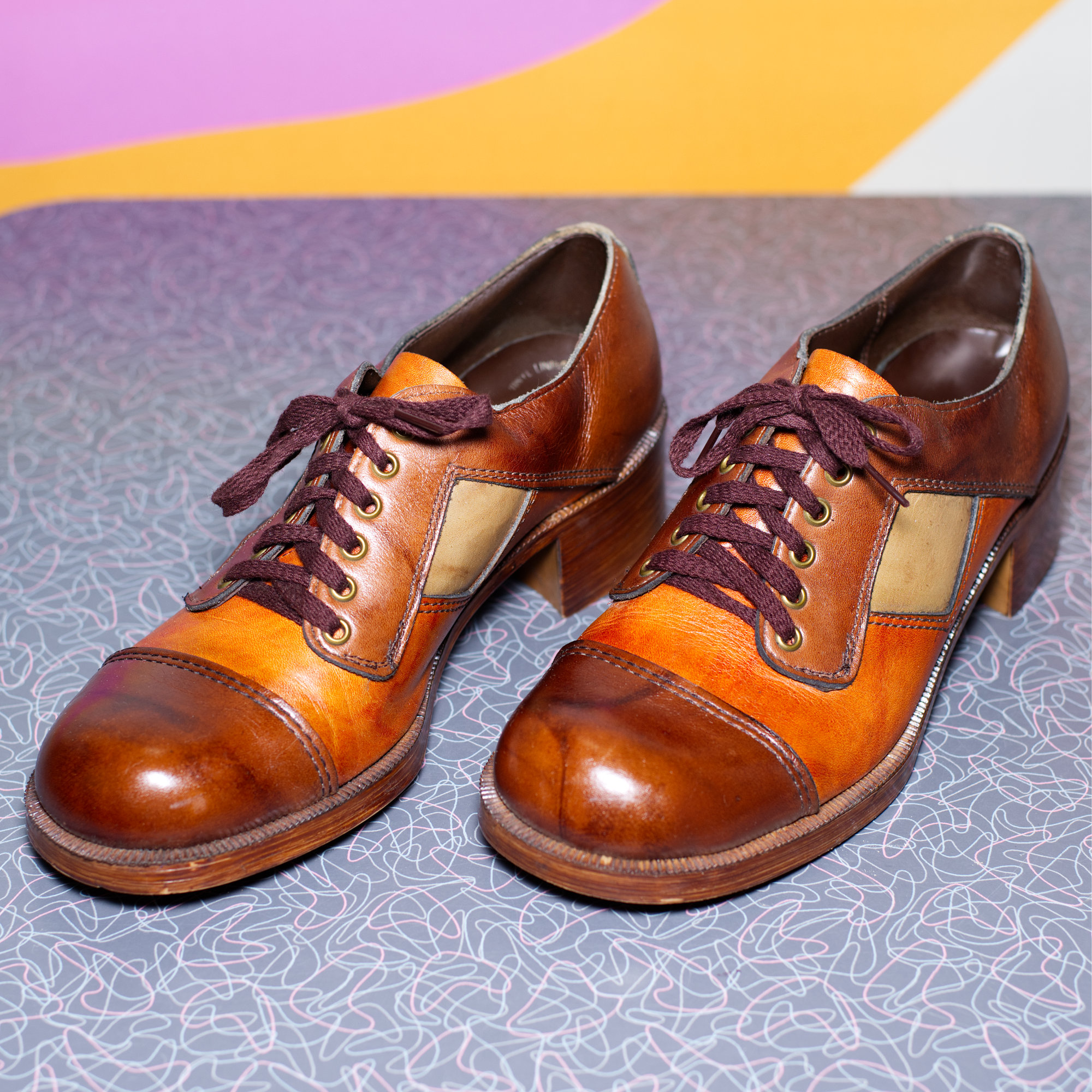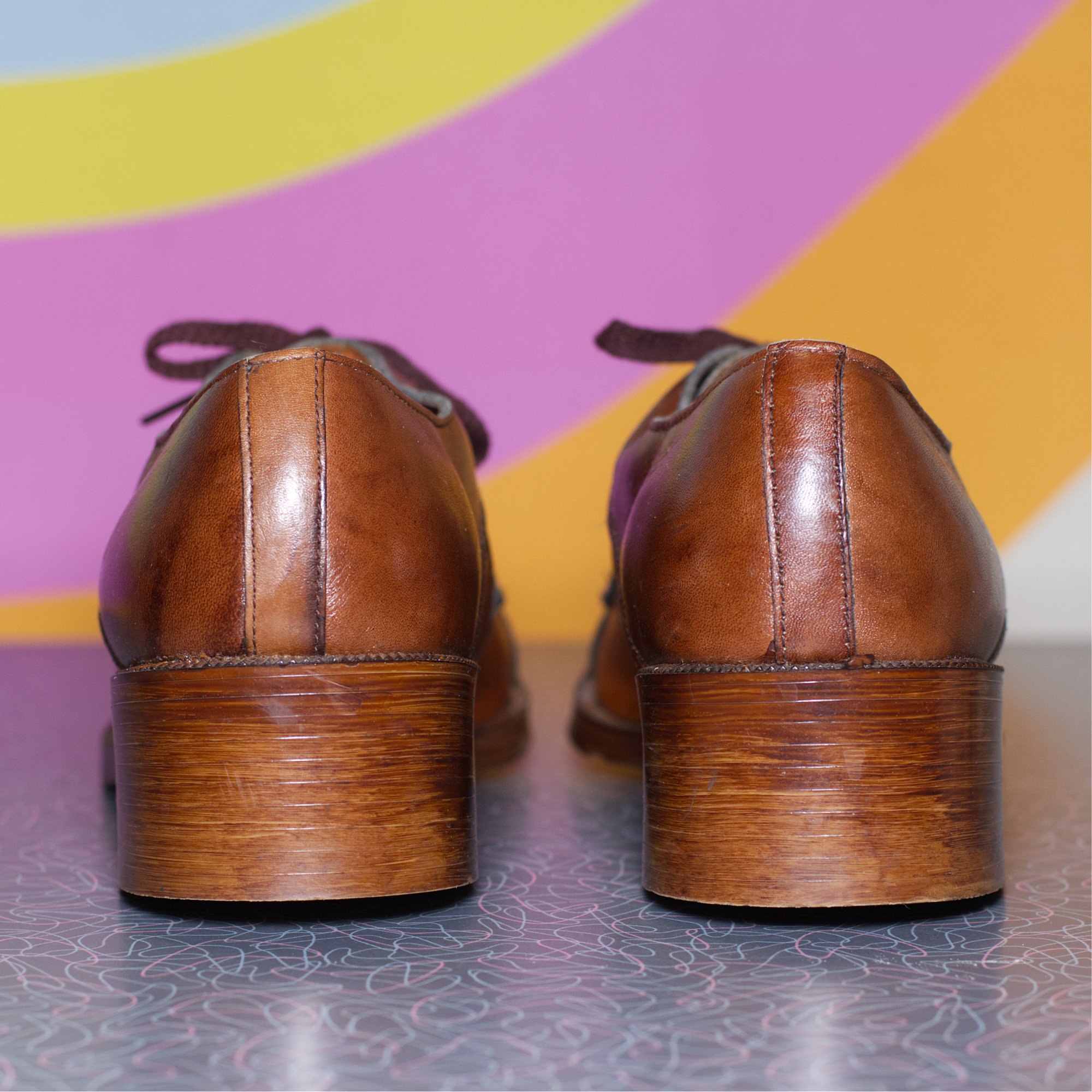 AMAZING early 70s tri-tone brown leather stacked wood block heel oxford shoes.