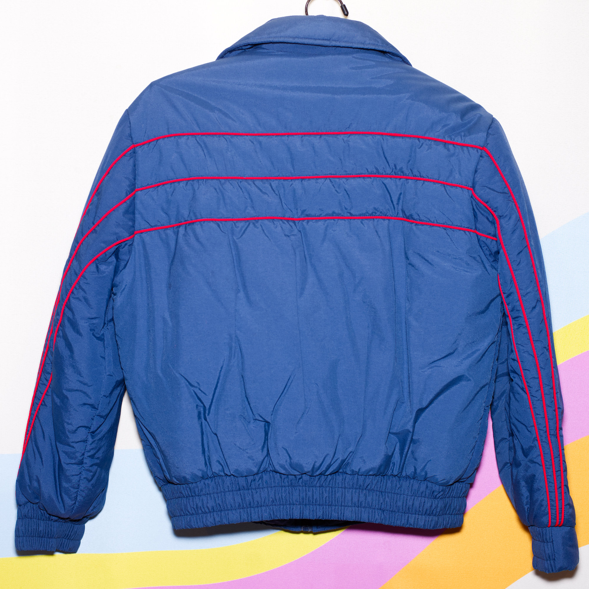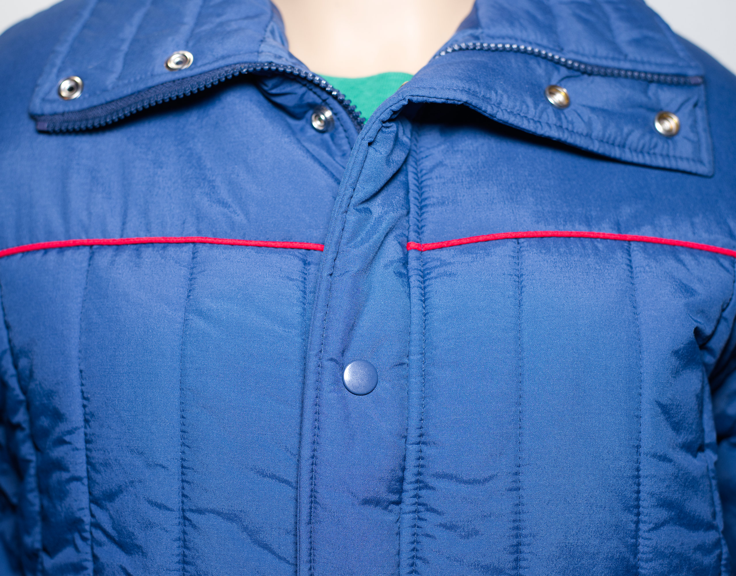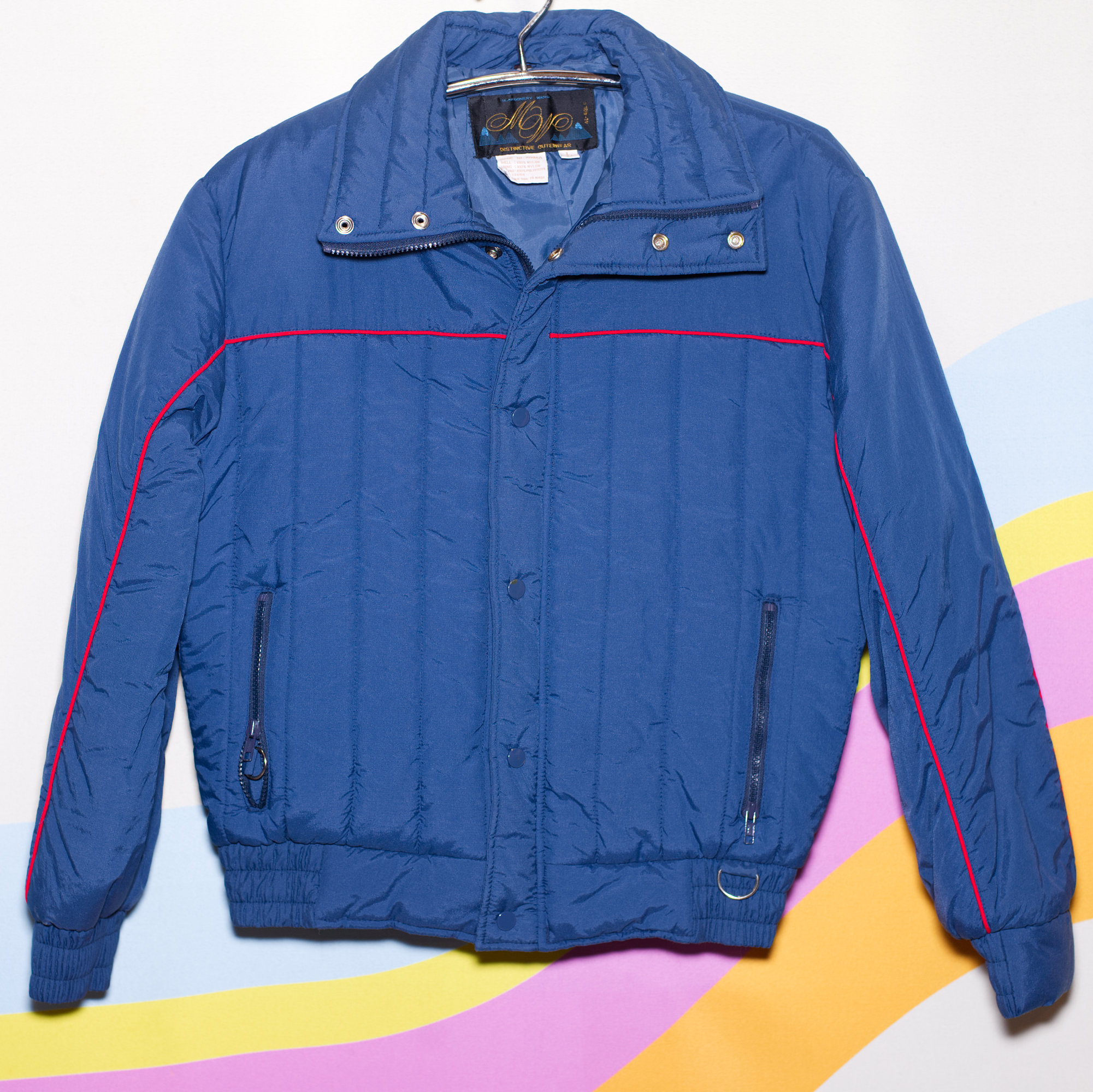Awesome 70s dark blue ski jacket with red piping. Zip and snap closure. Has ski tag rings in the pocket and on the bottom band.