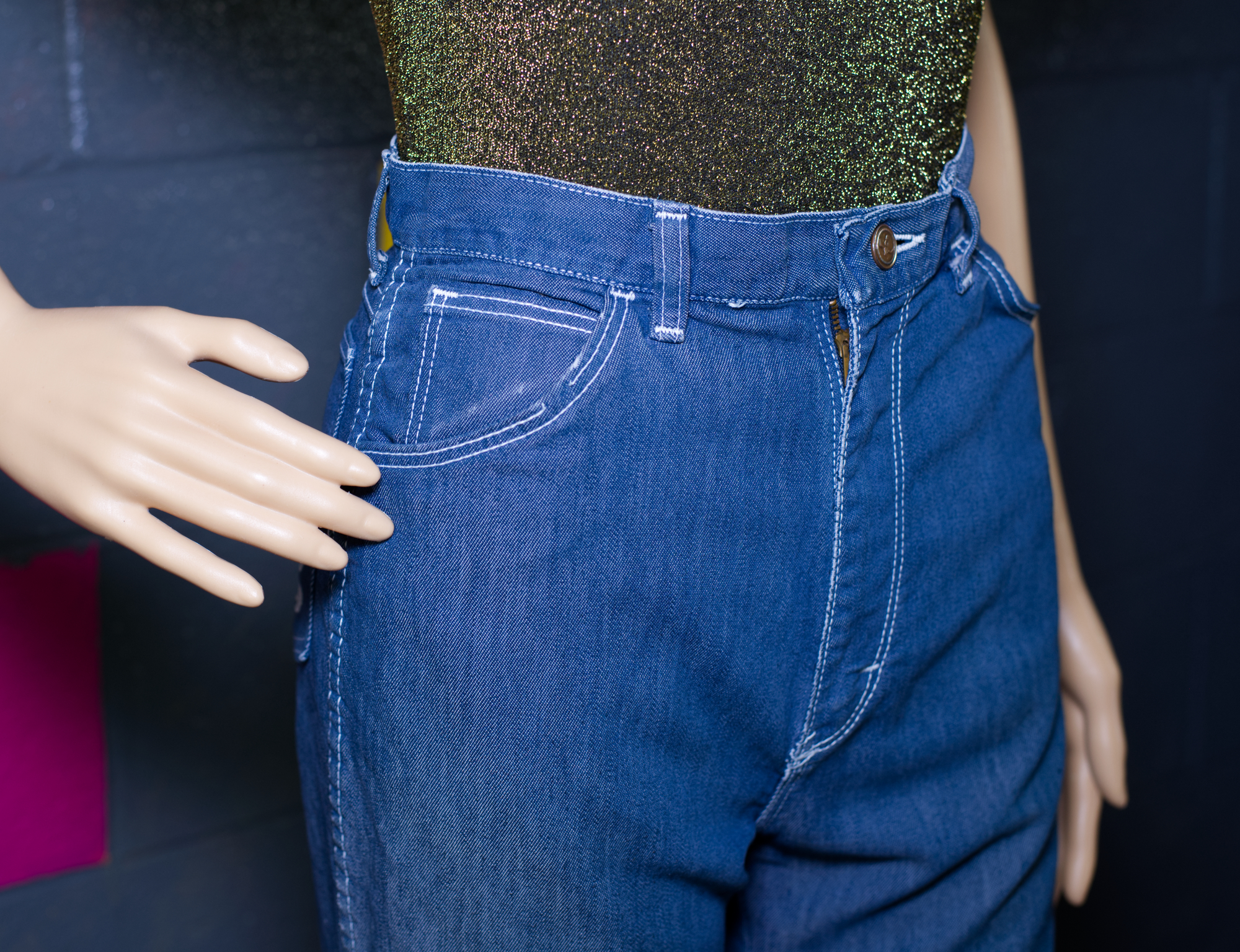 In good vintage condition, with the exception of a couple of missing stitches on one pocket (see photo) and a small lightened spot on one leg.