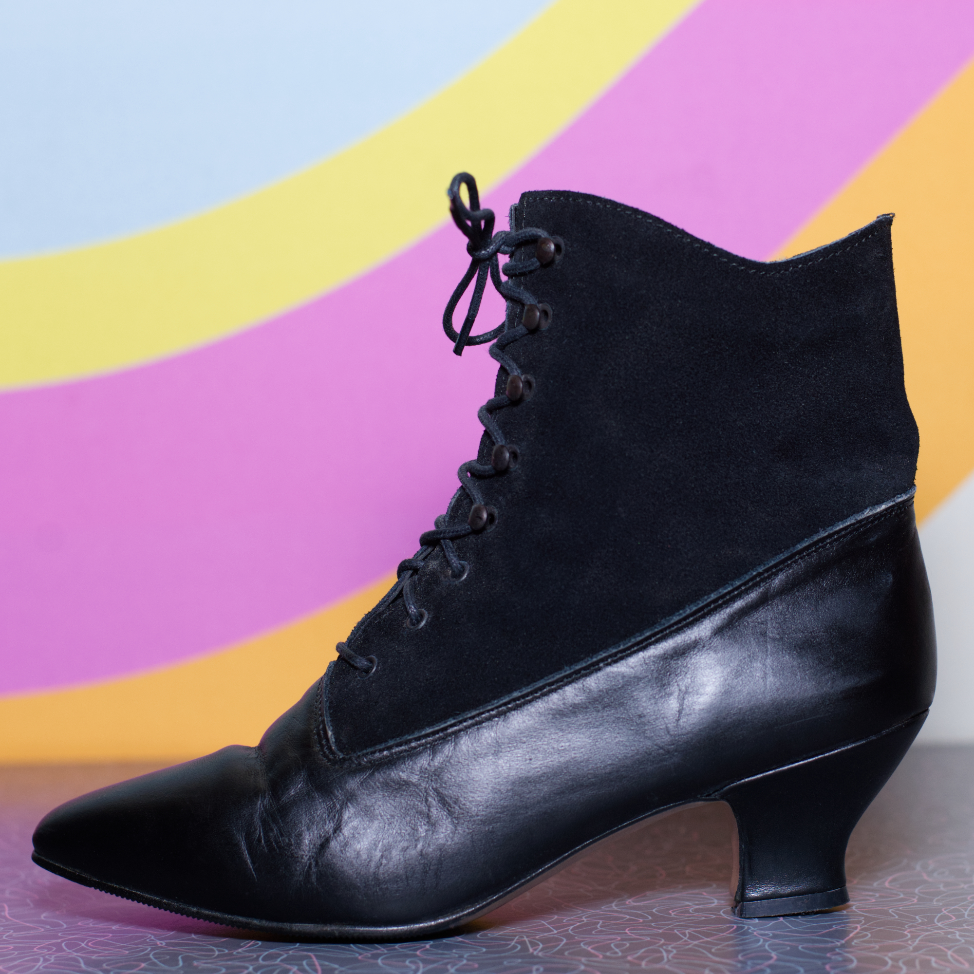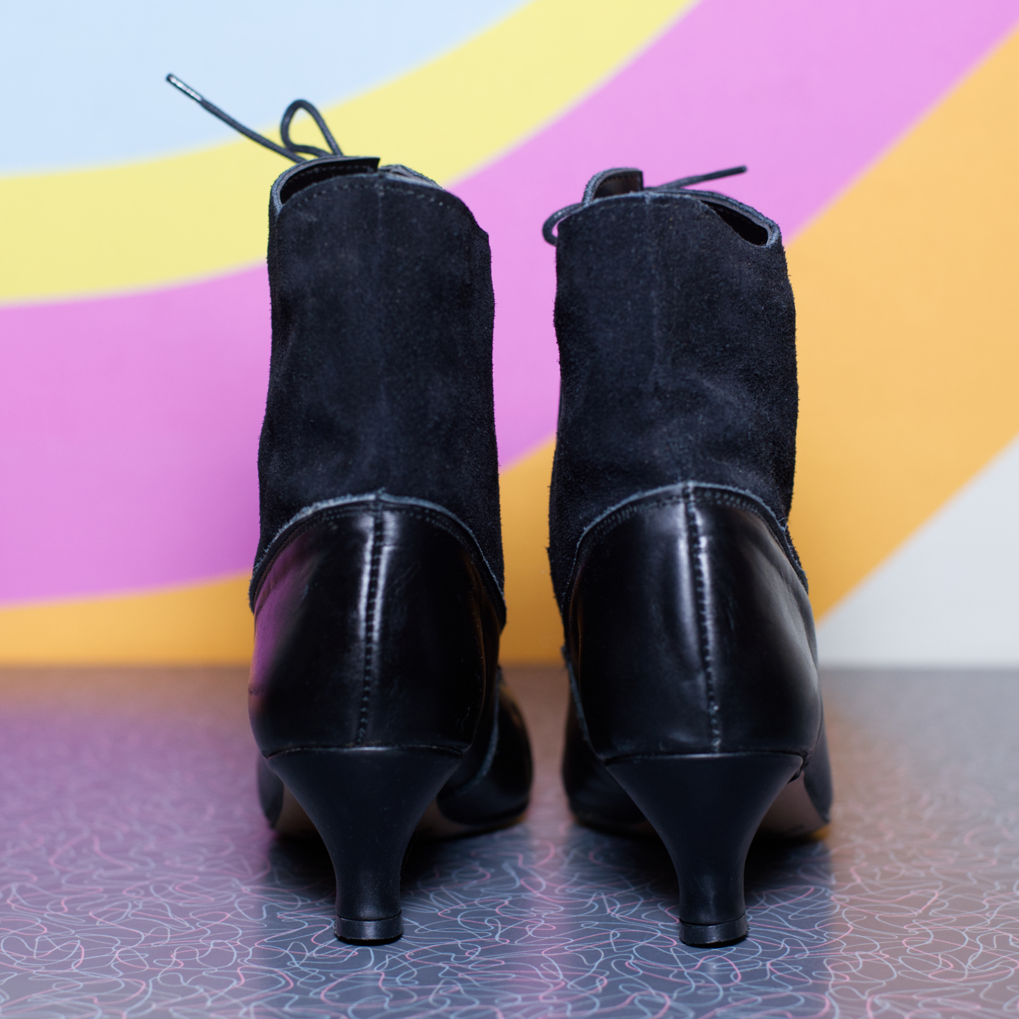 Super cute 80s black, low-heeled, lace-up ankle boots. Both suede and leather.