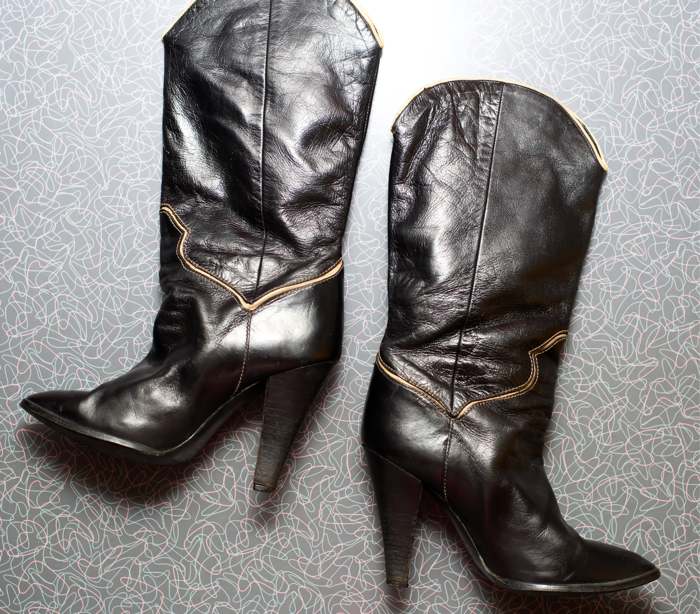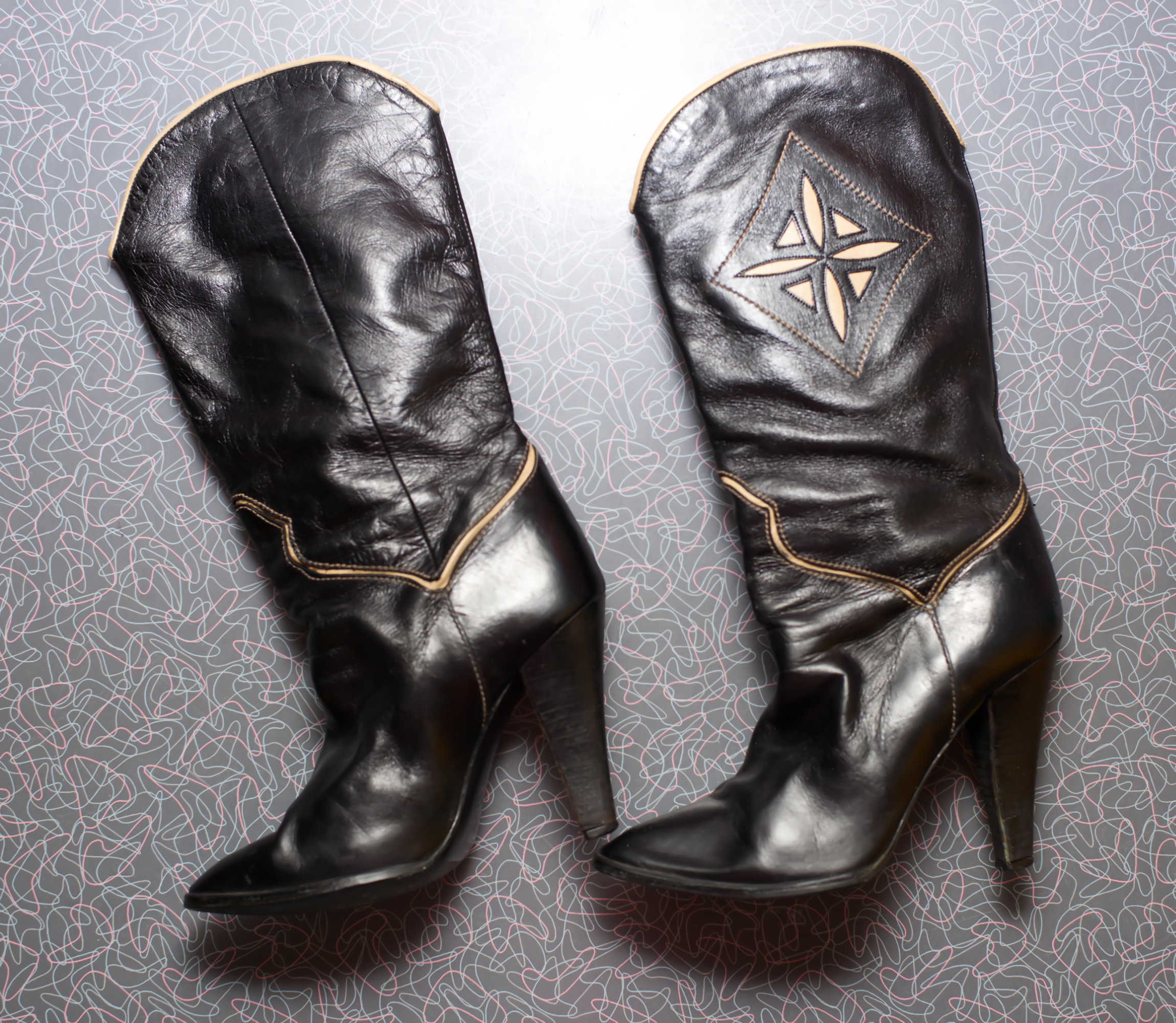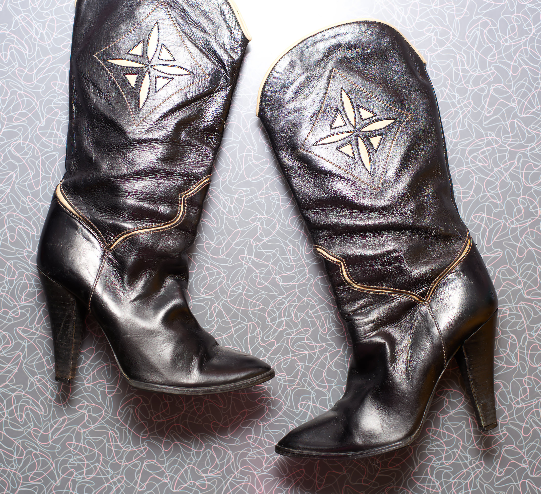 Super cute 80s high heeled western boots, with a cream inlay.