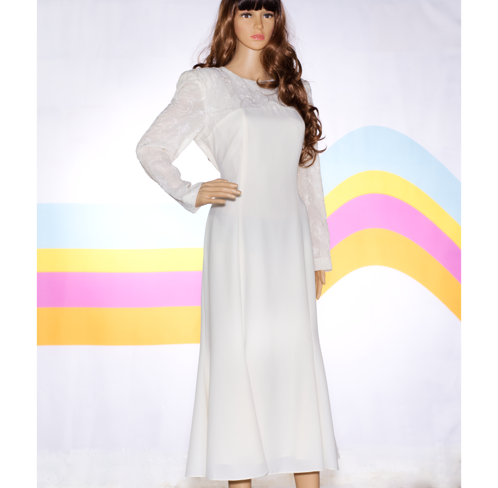 Beautiful 90s ivory/cream midi dress, with a slight mermaid shape. Has attached chiffon ties for a fitted waist.