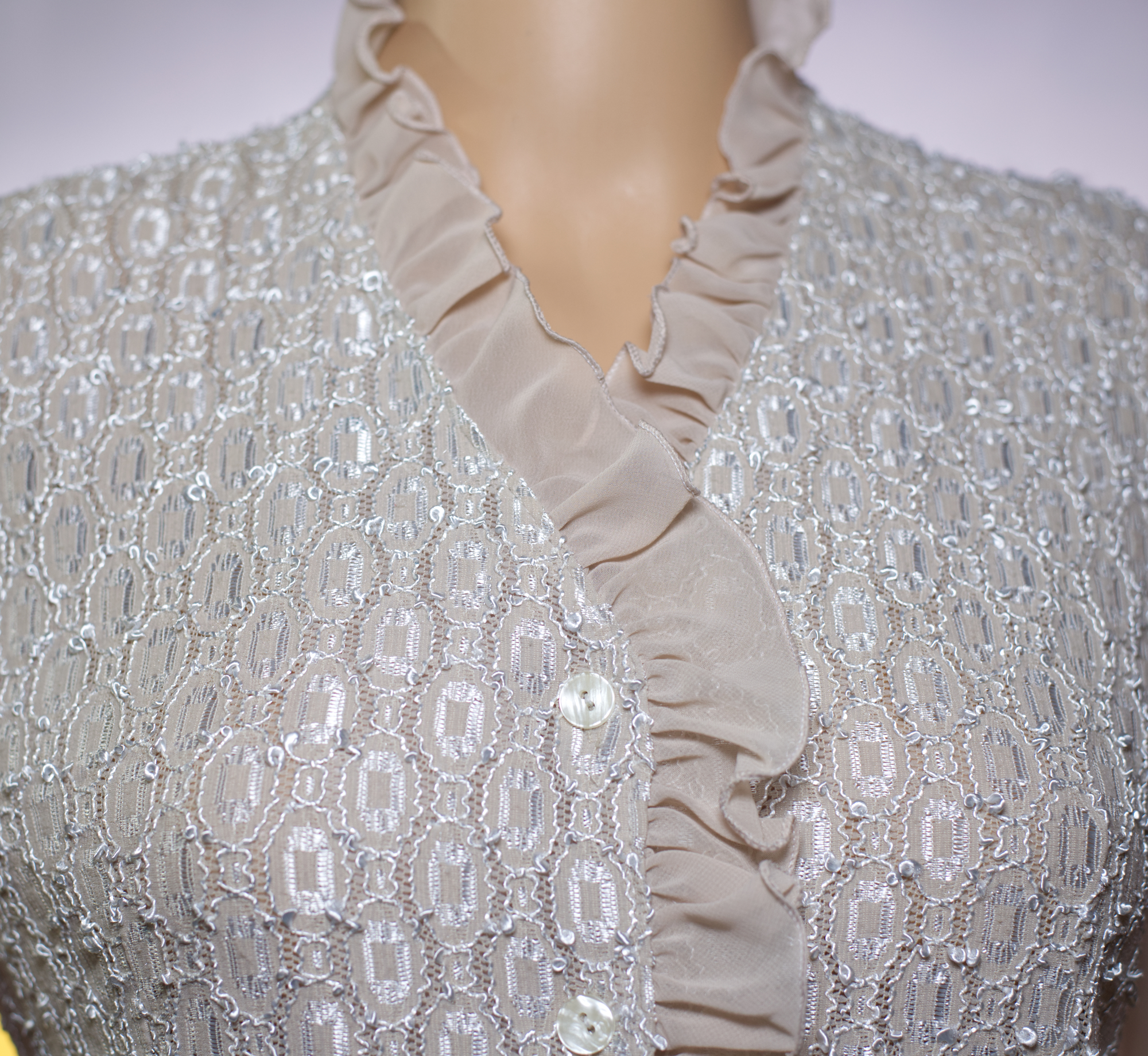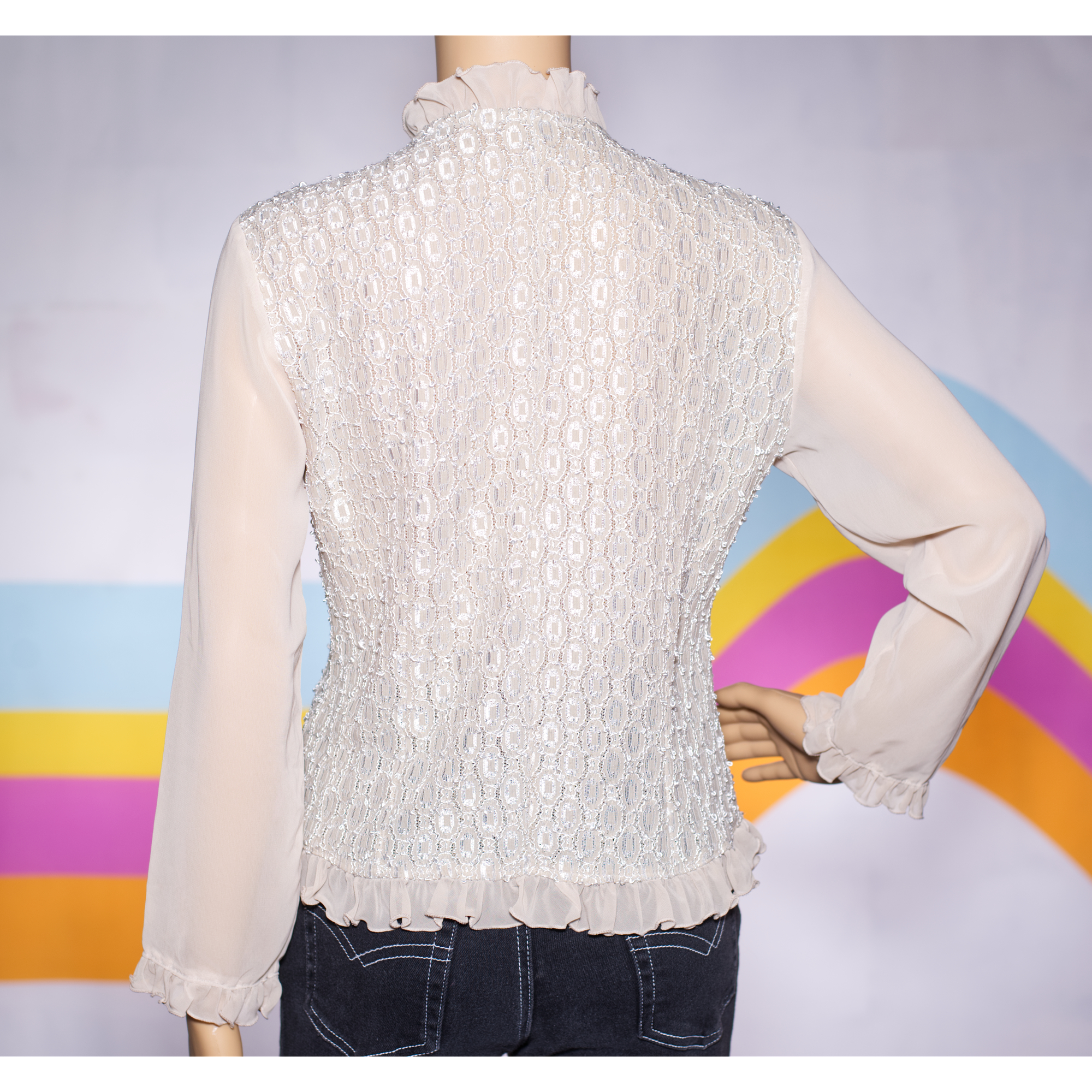 Super cute 90s light beige lace blouse with sheer sleeves and ruffled trim.