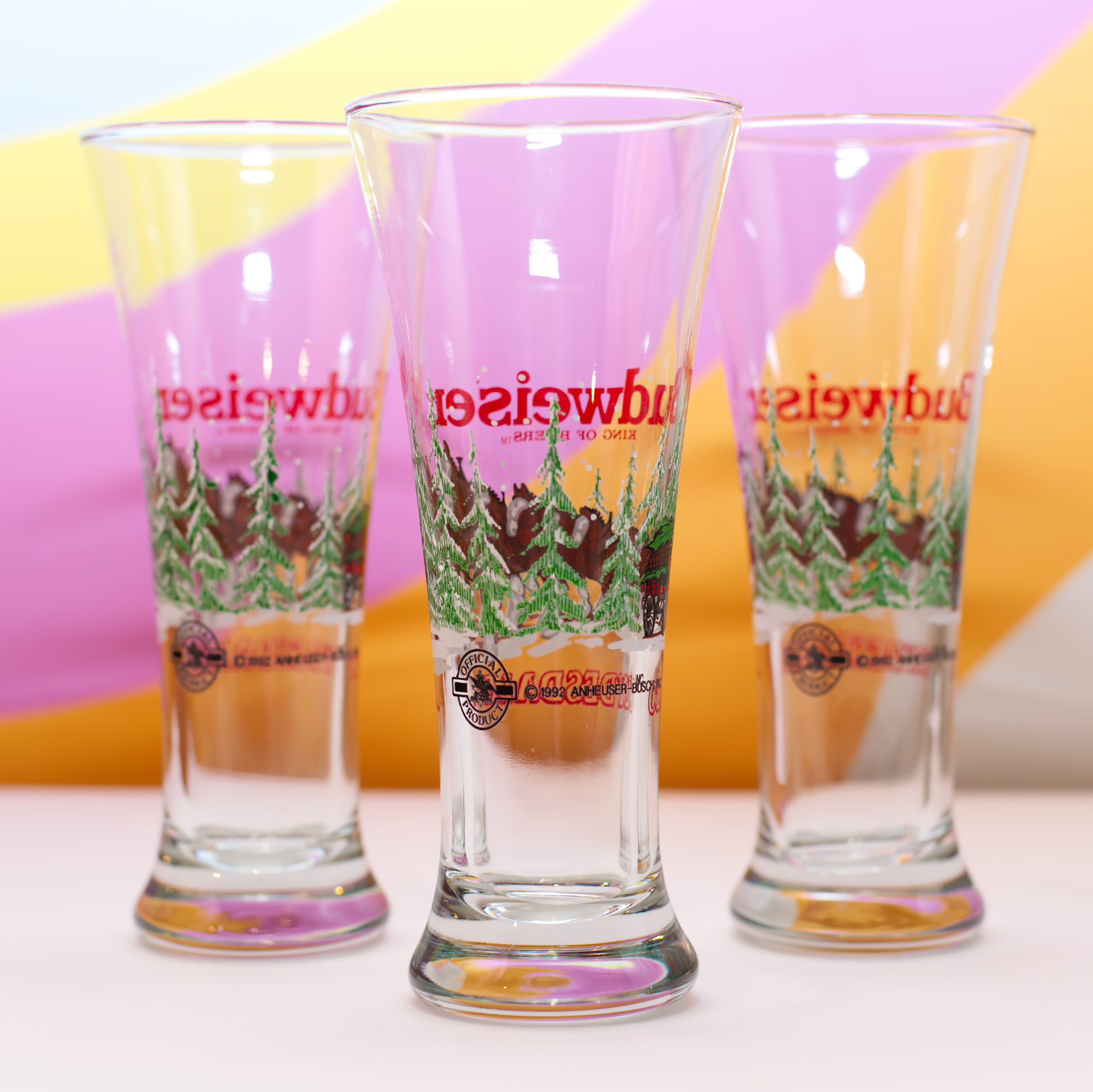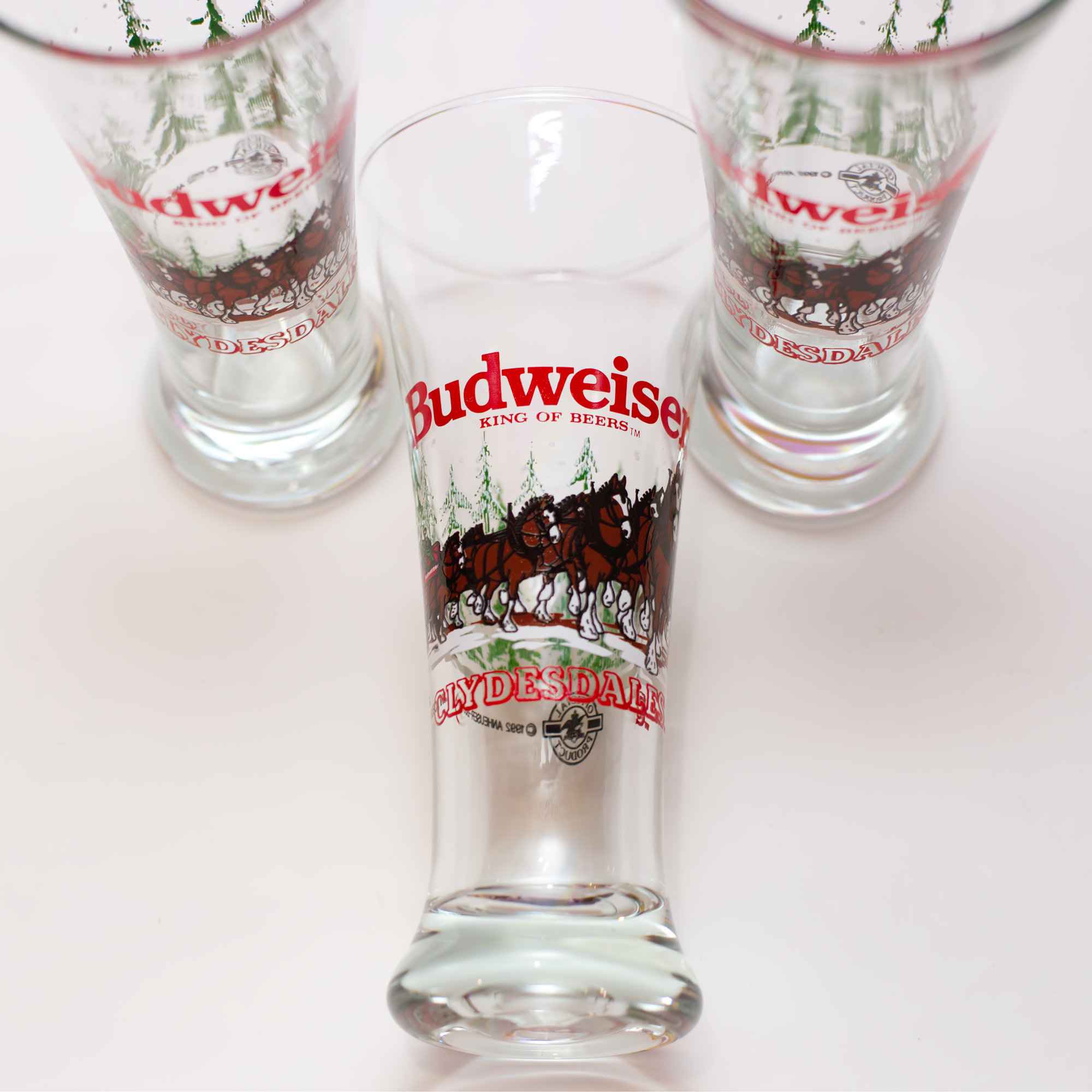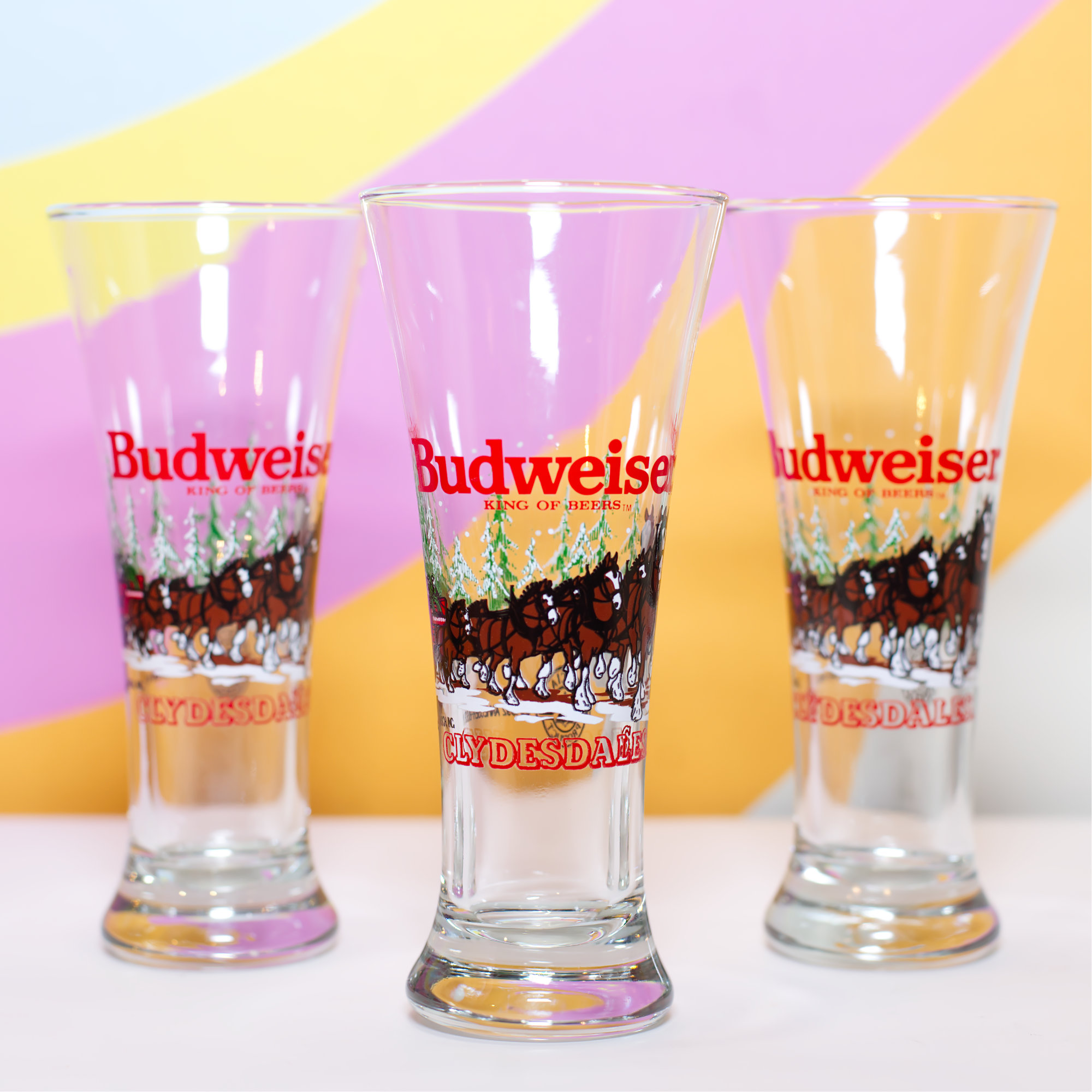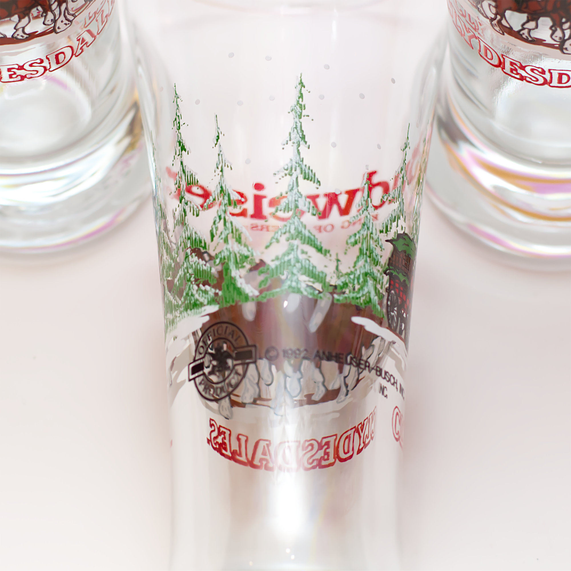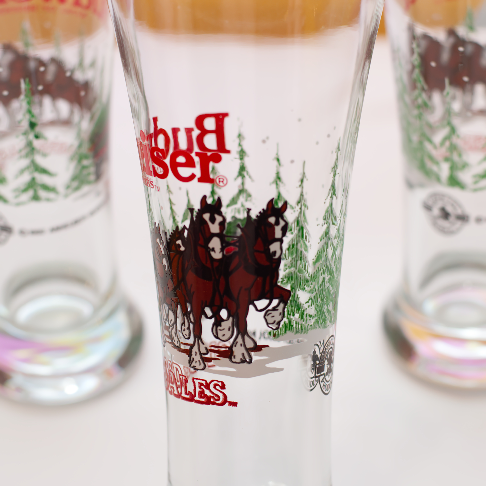 Awesome 1992 Holiday Budweiser Anheuser-Busch beer glasses featuring the clydesdale horses.