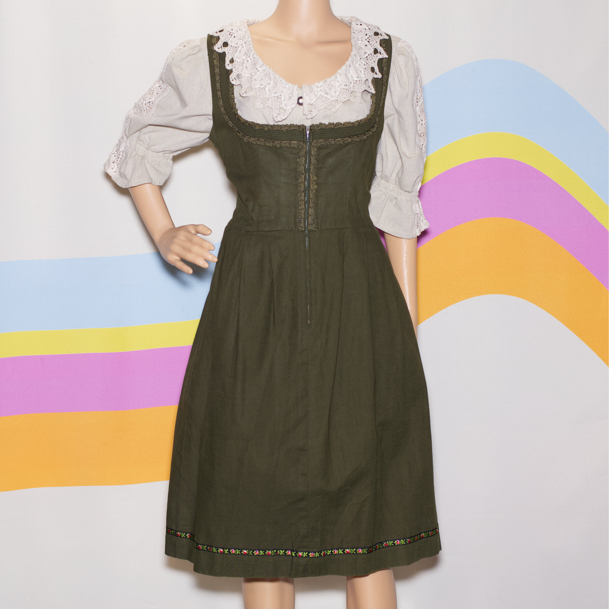 Super cute 1980s Bavarian dress, blouse, and apron set. The dress and apron are made by the iconic Kruger Dirndl of Berchtesgaden (Berchtesgaden is a historic, scenic market town in the Bavarian Alps of Germany, near Salzburg).